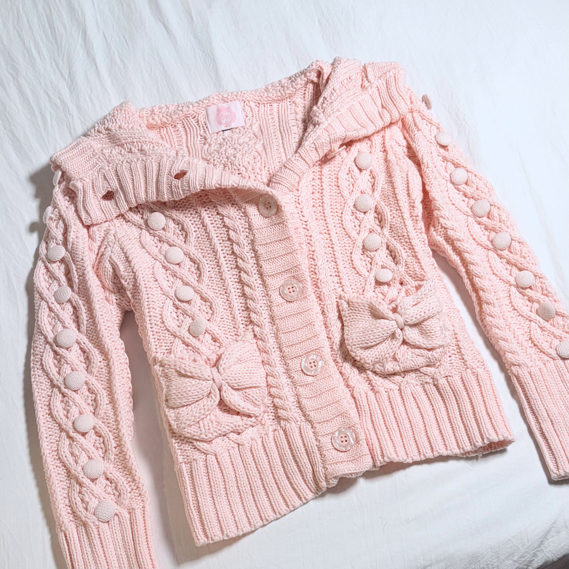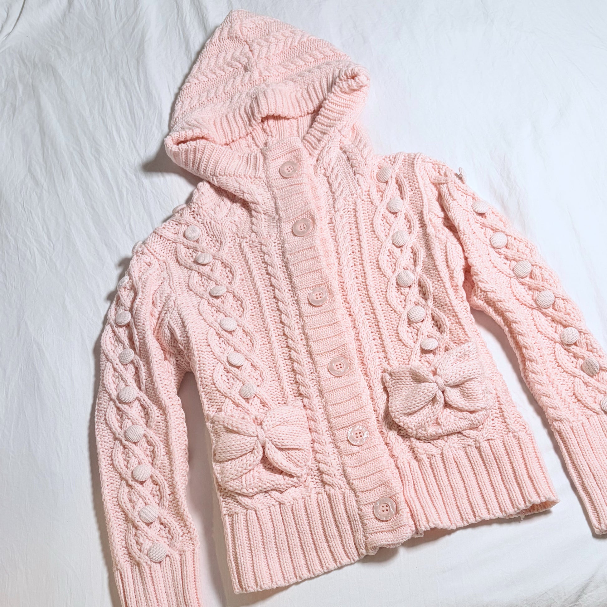 ˚₊‧꒰ა whipped up especially for you, this blush pink cardigan is crafted with delicate cable knit stitching, pearlescent buttons, and the dolliest bow pockets. With the most delicate bobble accents along the sleeves, front, and back this piece is made to feel comforting against your skin with a super flattering fit. Each element of the design is thoughtfully chosen to be perfectly cozy, cute and romantic, making it a love letter in knit form from me to you.